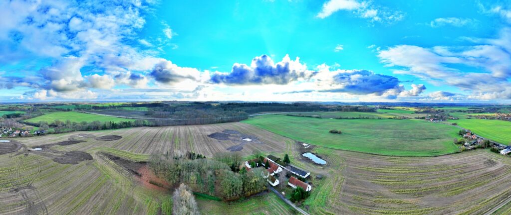 * Det store billede består at 101 billeder, som er sat sammen. Billederne er taget i 99 meters højde og er taget i en lodret vinkel ned, så det store billede kunne laves. Jeg lavede det ”i hånden” altså styrede dronen selv, så det mangler nogle hjørner i billedet. MEN det vil kunne laves automatisk fremover, så det bliver fejlfrit – OG 100% ens hver gang. Ligesom timelapse optagelser (som det så også kan bruges til)